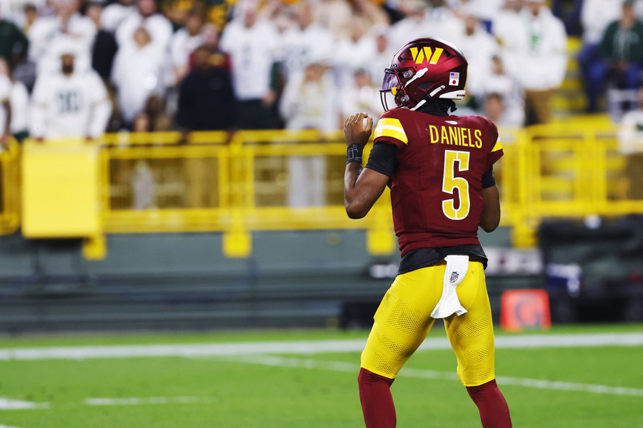 GREEN BAY, WI – SEPTEMBER 11: Washington Commanders quarterback Jayden Daniels 5 drops to pass during a game between the Green Bay Packers and the Washington Commanders on September 11, 2025 at Lambeau Field in Green Bay, WI. Photo by Larry Radloff/Icon Sportswire NFL, American Football Herren, USA SEP 11 Commanders at Packers EDITORIAL USE ONLY Icon2509118426