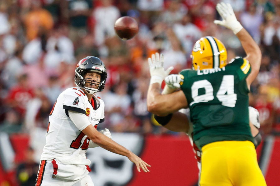 September 25, 2022, Tampa, Florida, USA: Tampa Bay Buccaneers quarterback Tom Brady 12 throws a pass, while being pressured by Green Bay Packers defensive end Dean Lowry 94 during the fourth quarter at Raymond James Stadium in Tampa on Sunday, Sept. 25, 2022. Tampa USA – ZUMAs70_ 20220925_zan_s70_114 Copyright: xJeffereexWoox