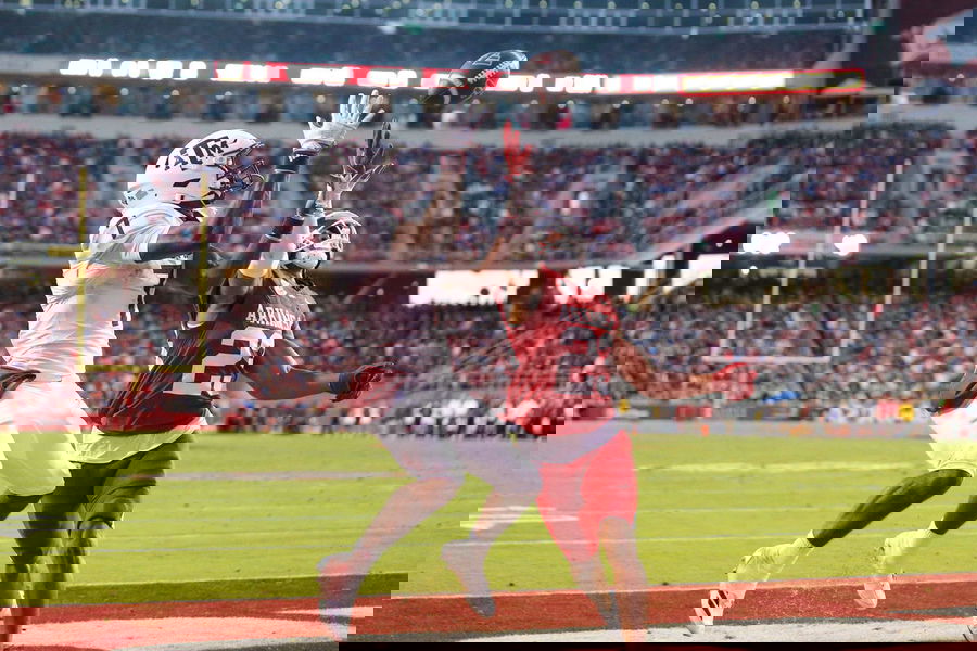 October 18, 2025: Arkansas defensive back Julian Neal 23 works to break up a pass intended for Texas A&M receiver KC Concepcion 7. Texas A&M defeated Arkansas 45-42 in Fayetteville, AR. /CSM Fayetteville USA – ZUMAcm9_ 20251018_faf_cm9_058 Copyright: xRicheyxMillerx