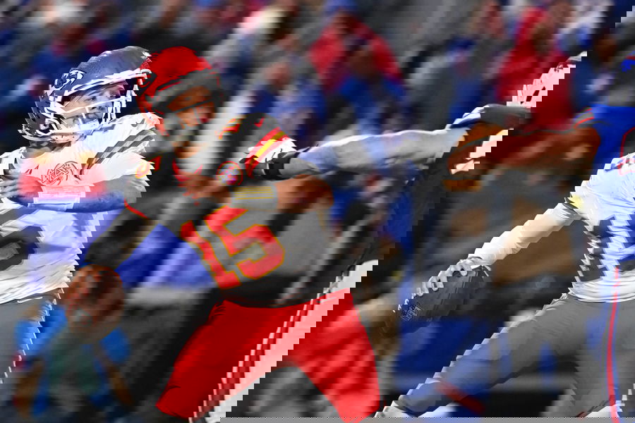 NFL, American Football Herren, USA Kansas City Chiefs at Buffalo Bills Nov 2, 2025 Orchard Park, New York, USA Kansas City Chiefs quarterback Patrick Mahomes 15 throws the ball in the second half against the Buffalo Bills at Highmark Stadium. Orchard Park Highmark Stadium New York USA, EDITORIAL USE ONLY PUBLICATIONxINxGERxSUIxAUTxONLY Copyright: xMarkxKoneznyx 20251102_kdn_bk3_575