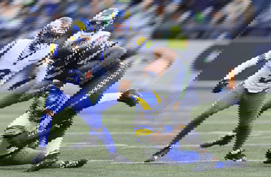 Seattle running back Kenneth Walker III 9 is tackled by the Los Angeles Rams defense after a gain of 14-yards on a short screen pass in the first quarter of an NFL, American Football Herren, USA Conference Championship game at Lumen Field in Seattle, Washington, on Sunday, January 25, 2026. PUBLICATIONxNOTxINxUSA SEA20260125814 GARYxCASKEY