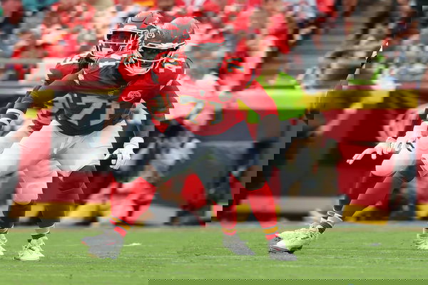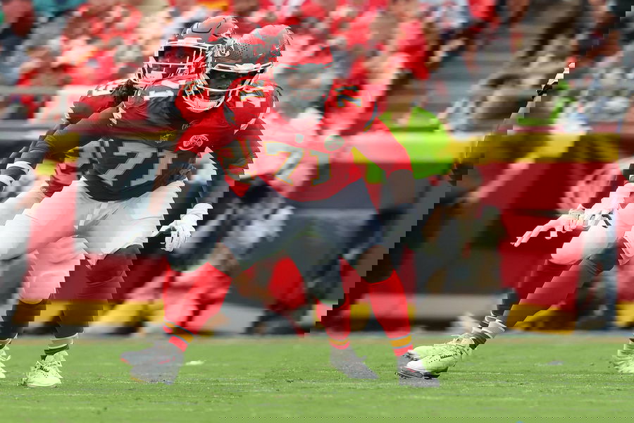 September 14, 2025: Kansas City Chiefs offensive tackle Josh Simmons 71 looks to block during an NFL, American Football Herren, USA football game against the Philadelphia Eagles at GEHA Field at Arrowhead Stadium in Kansas City, MO. /CSM Kansas City United States of America – ZUMAc04_ 20250914_zma_c04_675 Copyright: xDavidxSmithx