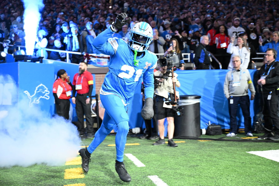 DETROIT, MI – DECEMBER 21: Detroit Lions cornerback Amik Robertson 21 during pregame introductions prior to the Detroit Lions versus the Pittsburgh Steelers game on Sunday December 21, 2025 at Ford Field in Detroit, MI. Photo by Steven King/Icon Sportswire NFL, American Football Herren, USA DEC 21 Steelers at Lions EDITORIAL USE ONLY Icon2582025122101452