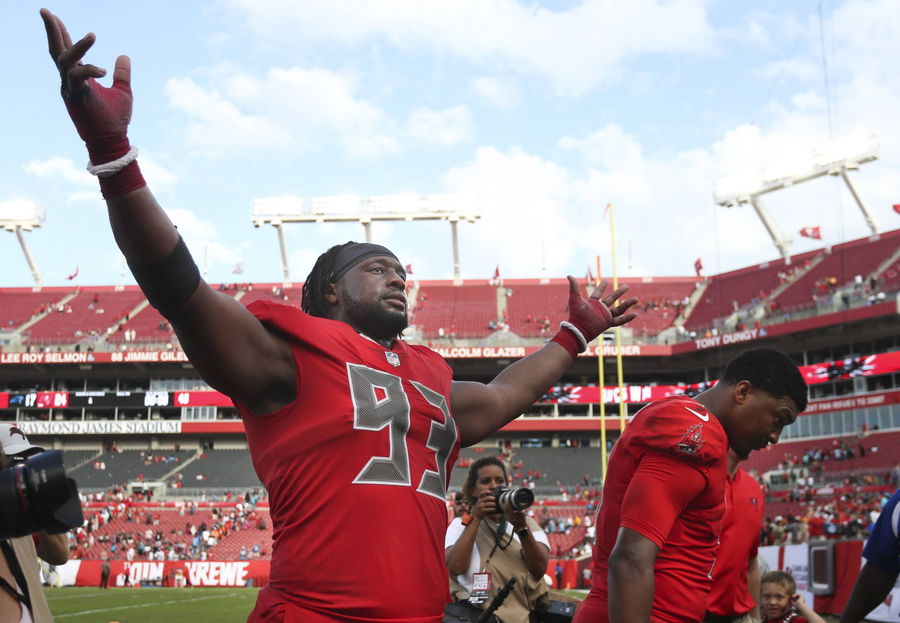 December 2, 2018 – Tampa, Florida, U.S. – DIRK SHADD Times .Tampa Bay Buccaneers defensive tackle Gerald McCoy (93) raises his arms up to celebrate to the fans while heading towards the tunnel and off the field after the Bucs defeated the Panthers with a final score of 24 to 17 at Raymond James Stadium in Tampa Sunday afternoon (12/02/18). On far with is quarterback Jameis Winston (3) Florida News – December 2, 2018 – ZUMAs70_ 87246418st Copyright: xDirkxShaddx