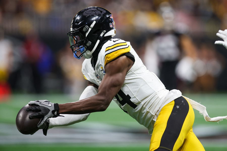 Sep 8, 2024; Atlanta, Georgia, USA; Pittsburgh Steelers wide receiver George Pickens (14) catches a pass against the Atlanta Falcons in the third quarter at Mercedes-Benz Stadium. Mandatory Credit: Brett Davis-Imagn Images