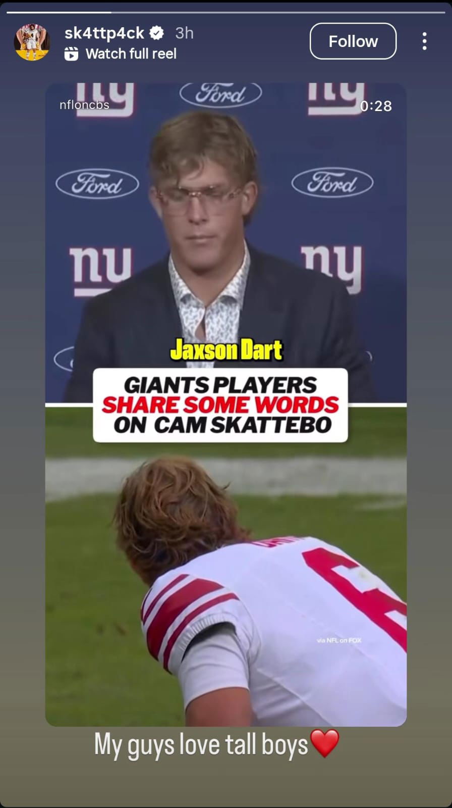 Sharing the clip of his teammates on his Instagram Story, Skattebo had just five words in the face of all the love and support: “My guys love tall boys ❤”