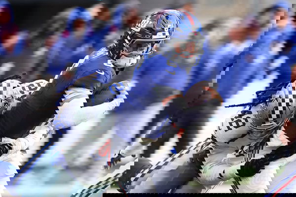 EAST RUTHERFORD, NJ – JANUARY 04: Jaxson Dart 6 of the New York Giants is tackled by Jadeveon Clowney 42 of the Dallas Cowboys during the game on January 4, 2026 at MetLife Stadium in East Rutherford, New Jersey. Photo by Rich Graessle/Icon Sportswire NFL, American Football Herren, USA JAN 04 Cowboys at Giants EDITORIAL USE ONLY Icon26010422188