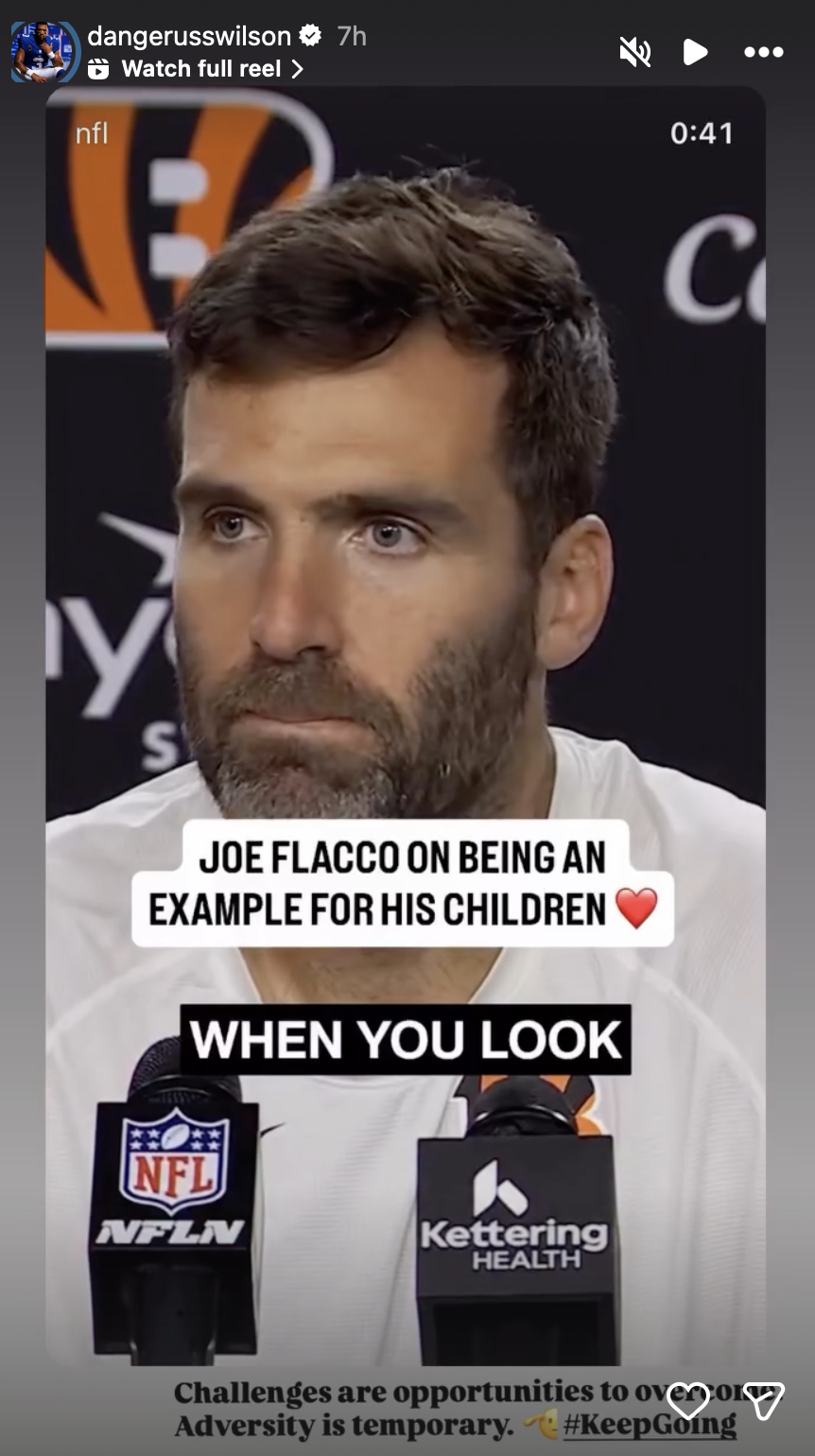 “Challenges are opportunities to overcome. Adversity is temporary. #KeepGoing,” Wilson wrote on his Instagram story. He had reposted a video of Flacco from one of his press conferences. In the Bengals-Steelers matchup, Joe proved he still has a lot to offer. But can the same be said for Wilson?