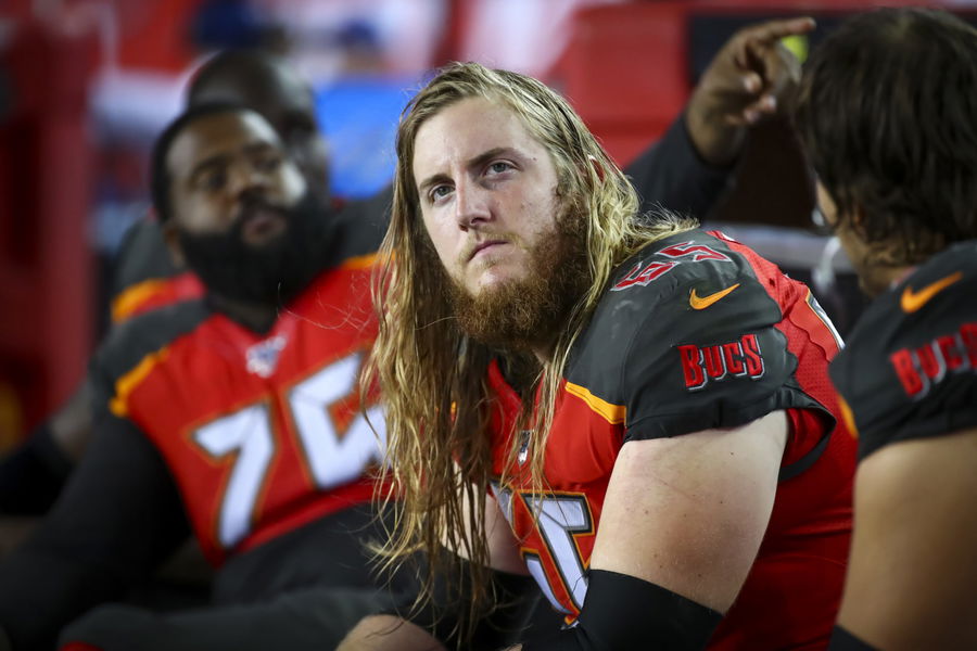TAMPA, FL – AUGUST 23: Alex Cappa #65 of the Tampa Bay Buccaneers looks on from the bench during the fourth quarter of the preseason game against the Cleveland Browns at Raymond James Stadium on August 23, 2019 in Tampa, Florida. (Photo by Will Vragovic/Getty Images)