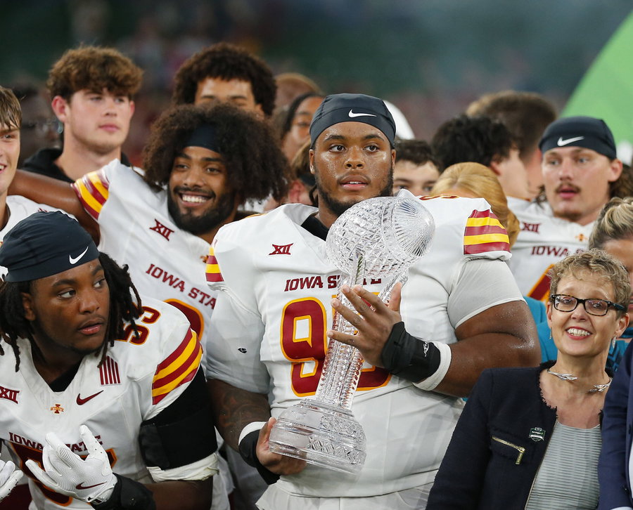 RECORD DATE NOT STATED 23rd August 2025 Aviva Stadium, Dublin, Ireland Aer Lingus College Football Classic, Kansas State versus Iowa State Iowa State defensive line Domonique Orange 95 with the winners trophy PUBLICATIONxNOTxINxUK PeterxFitzpatrick