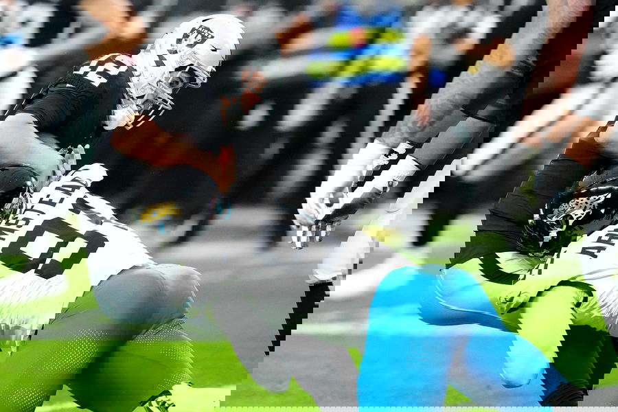 NFL, American Football Herren, USA Jacksonville Jaguars at Las Vegas Raiders Dec 22, 2024 Paradise, Nevada, USA Jacksonville Jaguars defensive end Arik Armstead 91 sacks Las Vegas Raiders quarterback Aidan O Connell 12 during the first quarter at Allegiant Stadium. Paradise Allegiant Stadium Nevada USA, EDITORIAL USE ONLY PUBLICATIONxINxGERxSUIxAUTxONLY Copyright: xStephenxR.xSylvaniex 20241222_szo_cs1_0752