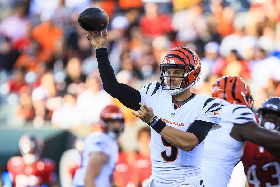 Aug 10, 2024; Cincinnati, Ohio, USA; Cincinnati Bengals quarterback Joe Burrow (9) throws a pass against the Tampa Bay Buccaneers in the first half at Paycor Stadium. Mandatory Credit: Katie Stratman-USA TODAY Sports