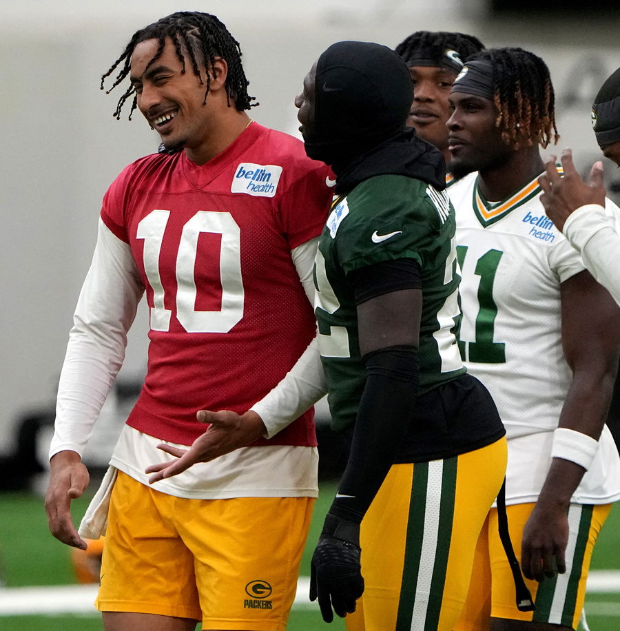 Jun 11, 2024; Green Bay, WI, USA; Green Bay Packers quarterback Jordan Love (10) laughs with teammates at minicamp. Mandatory Credit: Mark Hoffman-USA TODAY Sports