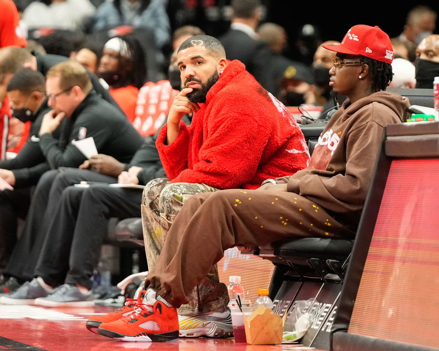 Oct 11, 2021; Toronto, Ontario, CAN; Drake looks on at a NBA game between the Houston Rockets and Toronto Raptors at Scotiabank Arena. Mandatory Credit: Kevin Sousa-USA TODAY Sports