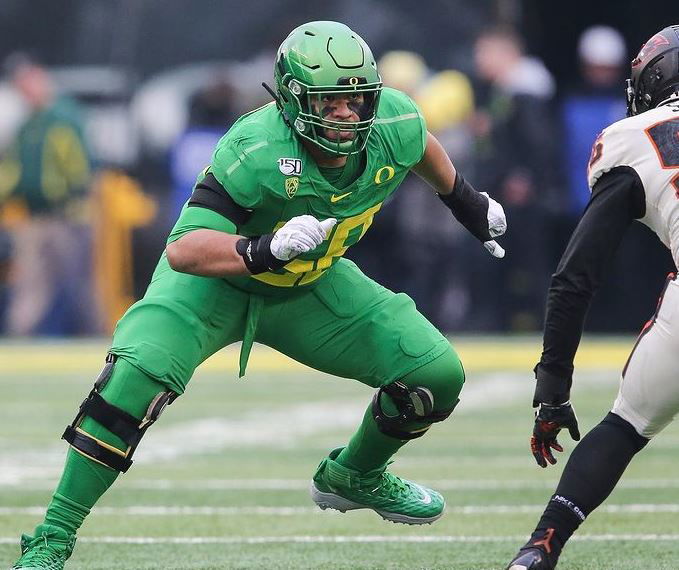 EUGENE, OREGON – OCTOBER 05: Penei Sewell #58 of the Oregon Ducks looks on prior to taking on the California Golden Bears during their game at Autzen Stadium on October 05, 2019 in Eugene, Oregon. (Photo by Abbie Parr/Getty Images)
