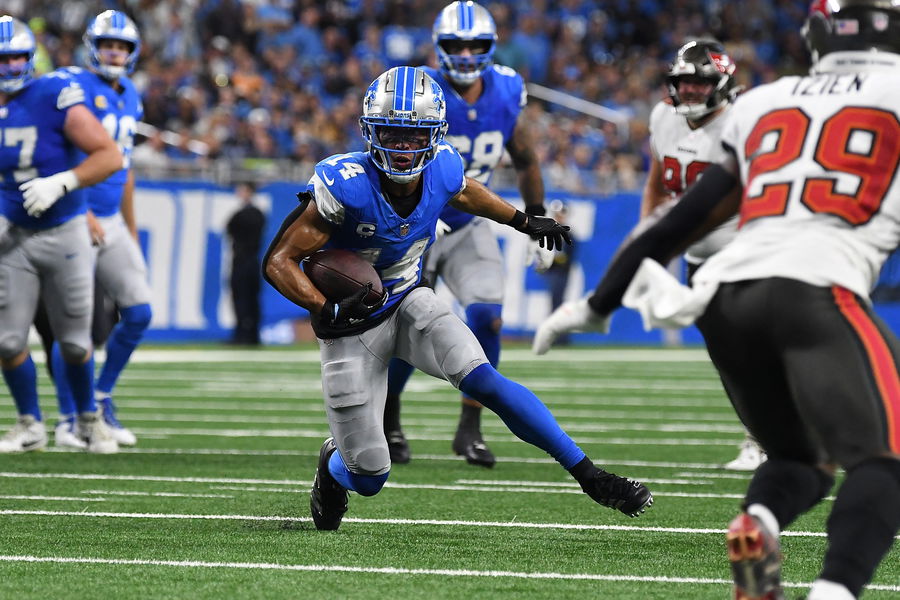 FILE PHOTO: Sep 15, 2024; Detroit, Michigan, USA; Detroit Lions wide receiver Amon-Ra St. Brown (14) runs the ball after catching a pass against the Tampa Bay Buccaneers in the second quarter at Ford Field. Mandatory Credit: Lon Horwedel-Imagn Images/File Photo