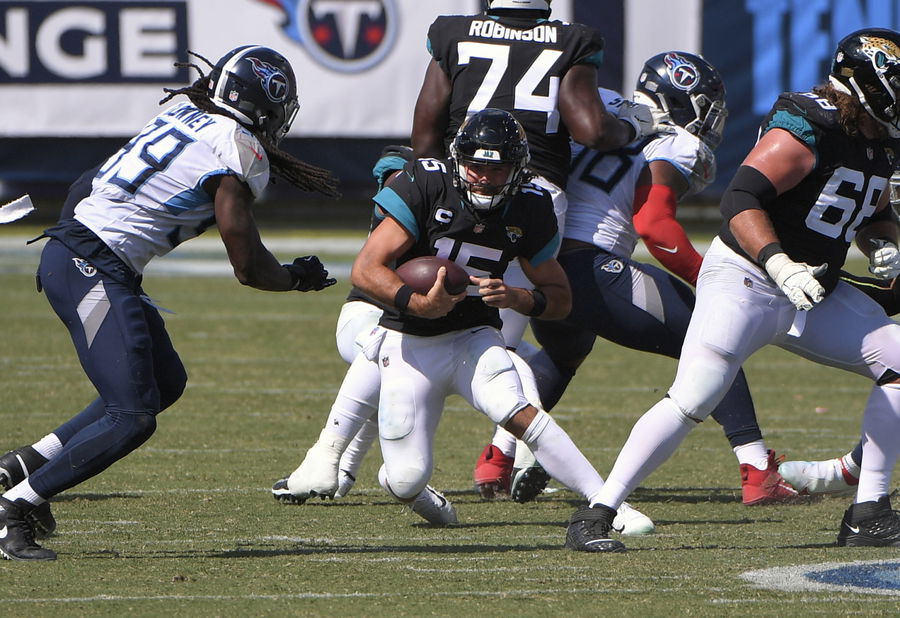 Sep 20, 2020; Nashville, Tennessee, USA; Jacksonville Jaguars quarterback Gardner Minshew (15) cuts back from Tennessee Titans linebacker Jadeveon Clowney (99) during the second half at Nissan Stadium. Mandatory Credit: Steve Roberts-USA TODAY Sports
