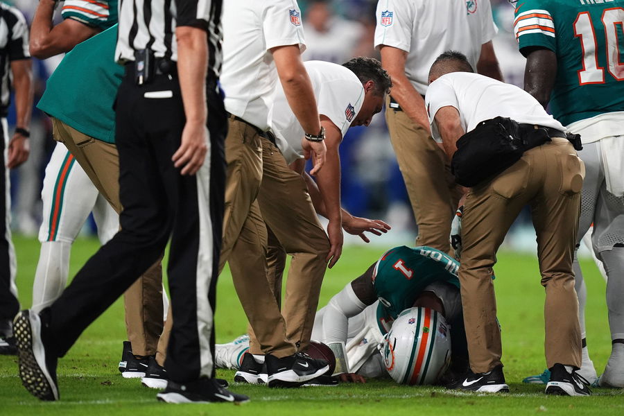 Sep 12, 2024; Miami Gardens, Florida, USA; A members of the Miami Dolphins training staff attend to quarterback Tua Tagovailoa (1) after an apparent injury during the second half against the Buffalo Bills at Hard Rock Stadium. Mandatory Credit: Jasen Vinlove-Imagn Images
