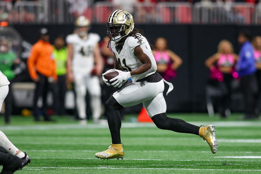 Sep 29, 2024; Atlanta, Georgia, USA; New Orleans Saints running back Alvin Kamara (41) runs the ball against the Atlanta Falcons in the first quarter at Mercedes-Benz Stadium. Mandatory Credit: Brett Davis-Imagn Images