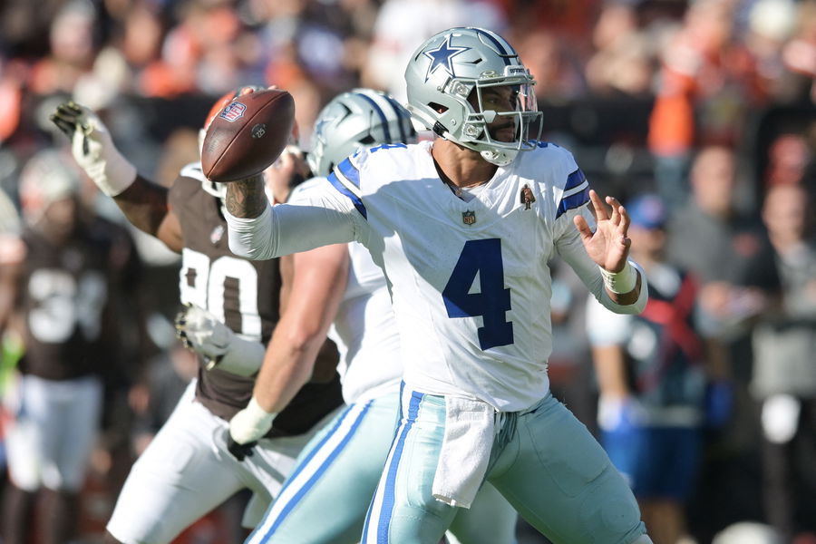 Sep 8, 2024; Cleveland, Ohio, USA; Dallas Cowboys quarterback Dak Prescott (4) throws a pass during the first half against the Cleveland Browns at Huntington Bank Field. Mandatory Credit: Ken Blaze-Imagn Images