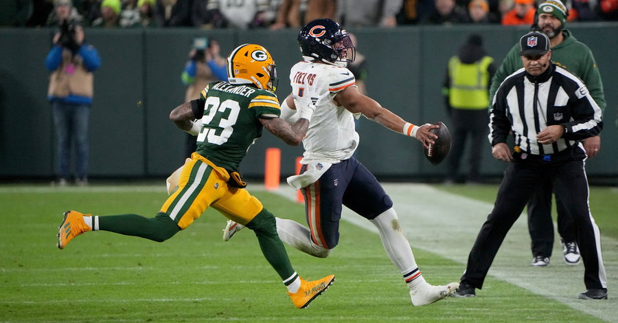 Jan 7, 2024; Green Bay, Wisconsin, USA; Green Bay Packers cornerback Jaire Alexander (23) runs Chicago Bears quarterback Justin Fields (1) out of bounds during the third quarter at Lambeau Field. Mandatory Credit: Mark Hoffman-USA TODAY Sports