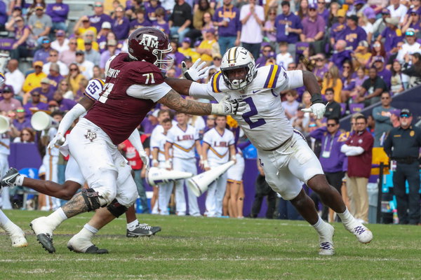 NCAA, College League, USA Football 2023: Texas A&M vs LSU NOV 25 November 25, 2023: LSU defensive end Ovie Oghoufo 2 tries to get around Texas A&M offensive lineman Chase Bisontis 71 during NCAA football game action between the Texas A&M Aggies and the LSU Tigers at Tiger Stadium in Baton Rouge, LA. Jonathan Mailhes/CSM Credit Image: Jonathan Mailhes/Cal Media Baton Rouge LA USA EDITORIAL USE ONLY Copyright: xx ZUMA-20231125_zma_c04_018.jpg JonathanxMailhesx csmphotothree202446