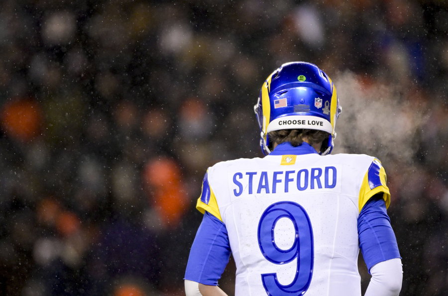 The words Choose Love are emblazoned on the back of Los Angeles Rams quarterback Matthew Stafford 9 helmet during an NFL, American Football Herren, USA Divisional round playoff game against the Chicago Bears at Soldier Field in Chicago on Sunday, January 18, 2026. The message honors the late Martin Luther King and reflects the values that he championed, according to a statement from the NFL. The Rams defeated the Bears 20-17 to advance to the NFC Championship. PUBLICATIONxNOTxINxUSA CHI20260118215 MARKxBLACK