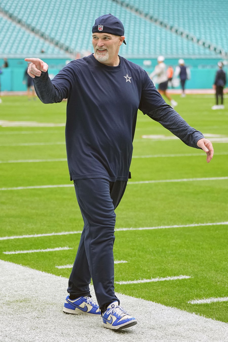 Dec 24, 2023; Miami Gardens, Florida, USA; Dallas Cowboys offensive coordinator Dan Quinn walks on the field prior to the game against the Miami Dolphins at Hard Rock Stadium. Mandatory Credit: Jasen Vinlove-USA TODAY Sports