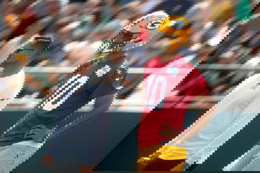 Syndication: Green Bay Press-Gazette, Green Bay Packers head coach Matt LaFleur and quarterback Jordan Love 10 participate in Packers training camp on Wednesday, July 27, 2022, at Ray Nitschke Field in Ashwaubenon, Wisconsin. Samantha Madar/USA TODAY NETWORK-Wis Gpg Green Bay Packers Training Camp Day 1 07272022 0007, 27.07.2022 14:49:02, 18753191, Jordan Love, Matt LaFleur, Ray Nitschke Field, USATNSYNDICATION, Ashwaubenon, Green Bay Packers, Player, Football player, Green Bay Packers NFL, Georgia Bulldogs PUBLICATIONxINxGERxSUIxAUTxONLY Copyright: xSamanthaxMadar/USAxTODAYxNETWORK-Wisconsinx 18753191