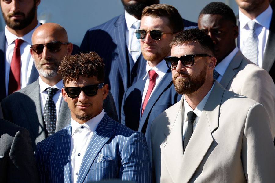 Kansas City Chiefs’s Patrick Mahomes and Travis Kelce look on as U.S. President Joe Biden (not pictured) welcomes Kansas City Chiefs to the White House to celebrate their championship season and victory in Super Bowl LVIII, in Washington, U.S., May 31, 2024. REUTERS/Evelyn Hockstein