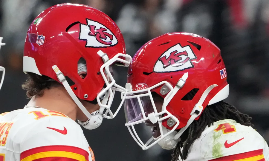Nov 26, 2023; Paradise, Nevada, USA; Kansas City Chiefs wide receiver Rashee Rice (4) celebrates with quarterback. Patrick Mahomes (15) after a touchdown against the Las Vegas Raiders in the second half at Allegiant Stadium. Mandatory Credit: Kirby Lee-USA TODAY Sports Kirby Lee, Kirby Lee-USA TODAY Sports