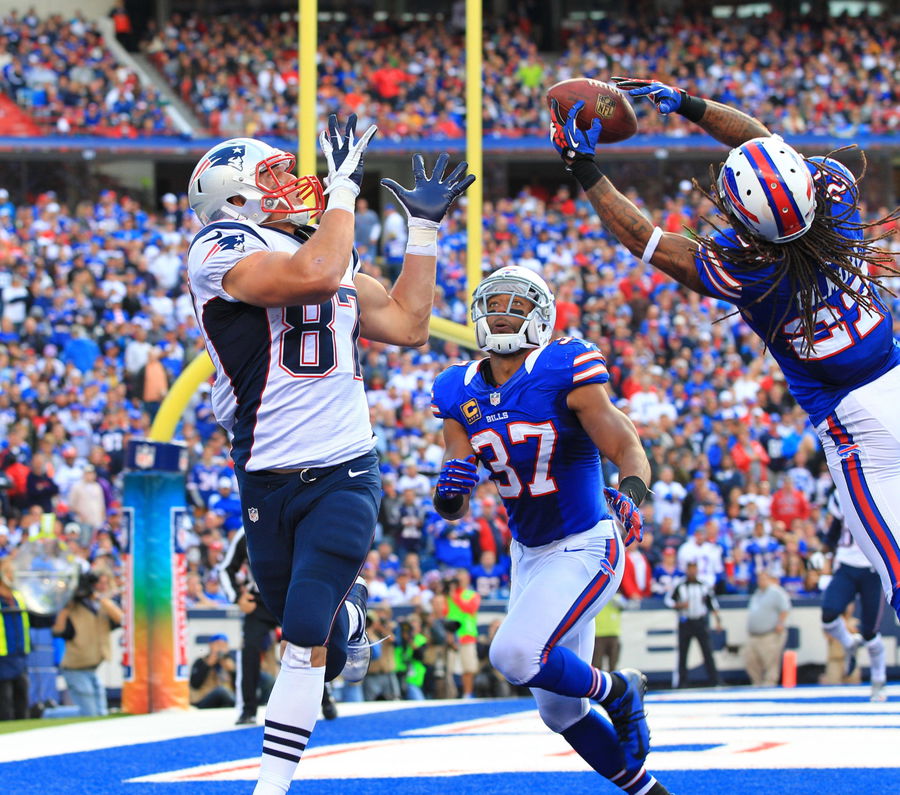 NFL, American Football Herren, USA New England Patriots at Buffalo Bills Sep 30, 2012 Orchard Park, NY, USA Buffalo Bills cornerback Stephon Gilmore 27 breaks up a pass to New England Patriots tight end Rob Gronkowski 87 as strong safety George Wilson 37 looks on during the second half at Ralph Wilson Stadium. Patriots beat the Bills 52-28. Orchard Park Ralph Wilson Stadium New York UNITED STATES, EDITORIAL USE ONLY PUBLICATIONxINxGERxSUIxAUTxONLY Copyright: xKevinxHoffman-USAxTODAYxSportsx 6623594