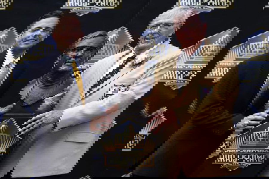 Ron Wolf, right, poses with a bust of him and with his presenter and son, Eliot Wolf, during the induction ceremony at the Pro Football Hall of Fame, Saturday, Aug. 8, 2015, in Canton, Ohio. Wolf, the man who brought Brett Favre to Green Bay, beat the quarterback to Canton. Wolf led off the eight-man Pro Football Hall of Fame Class of 2015. (AP Photo/Gene J. Puskar)(Gene J. Puskar)