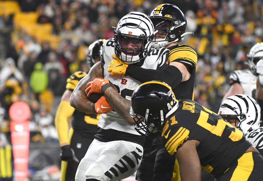 Nov 20, 2022; Pittsburgh, Pennsylvania, USA; Cincinnati Bengals running back Joe Mixon (28) is stopped by Pittsburgh Steelers linebacker Robert Spillane (41) and linebacker Myles Jack (51) during the second quarter at Acrisure Stadium. Mandatory Credit: Philip G. Pavely-USA TODAY Sports