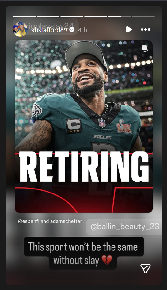 “This sport won’t be the same without Slay,” Matthew Stafford’s wife, Kelly Stafford, wrote as a caption of her Instagram story, including a broken heart emoji on ESPN’s post about the 35-year-old’s retirement.