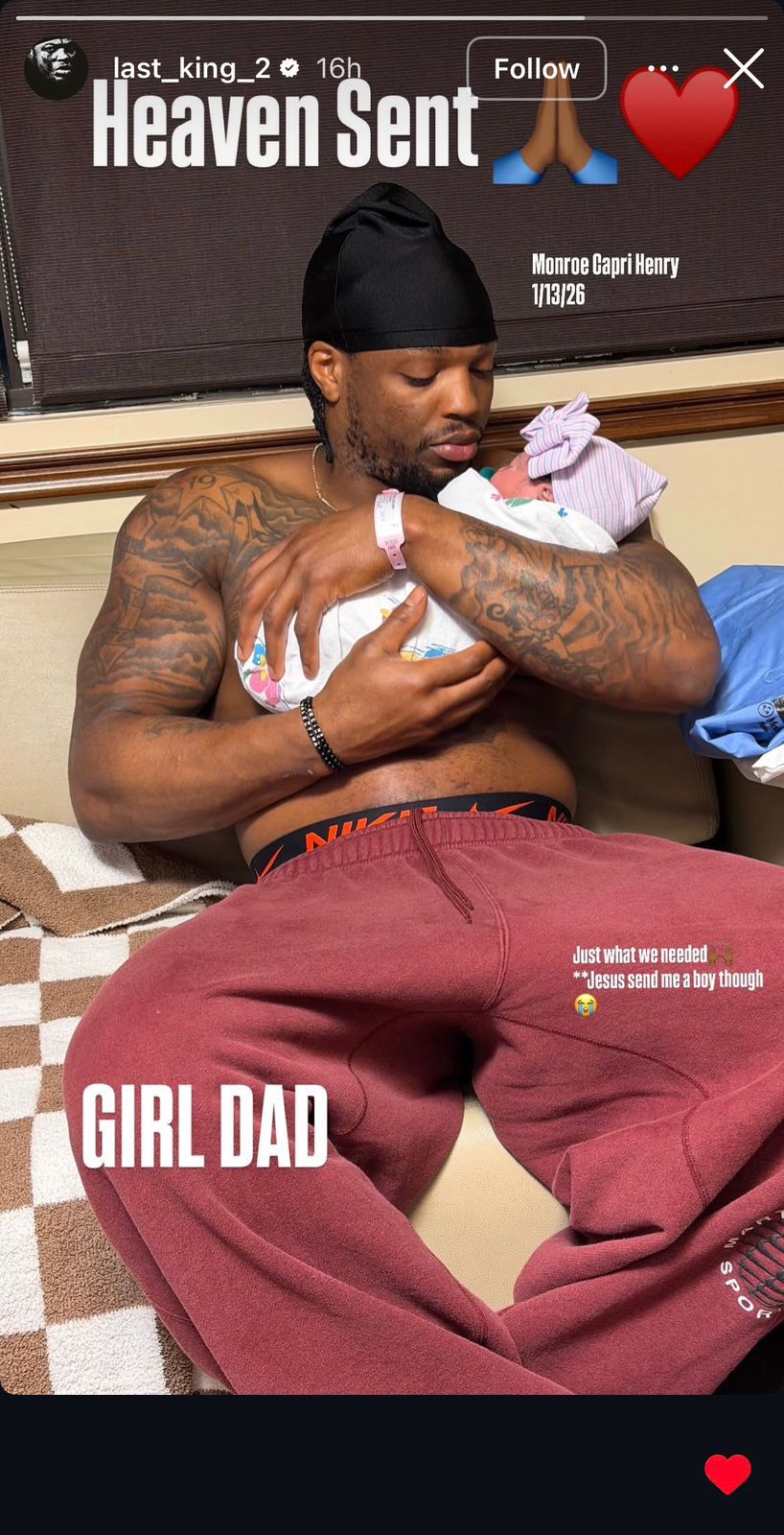 “Heaven Sent,” Henry wrote in the story caption, while holding the newborn close to his chest. “GIRL DAD, Just what we needed. Jesus, send me a boy, though.”