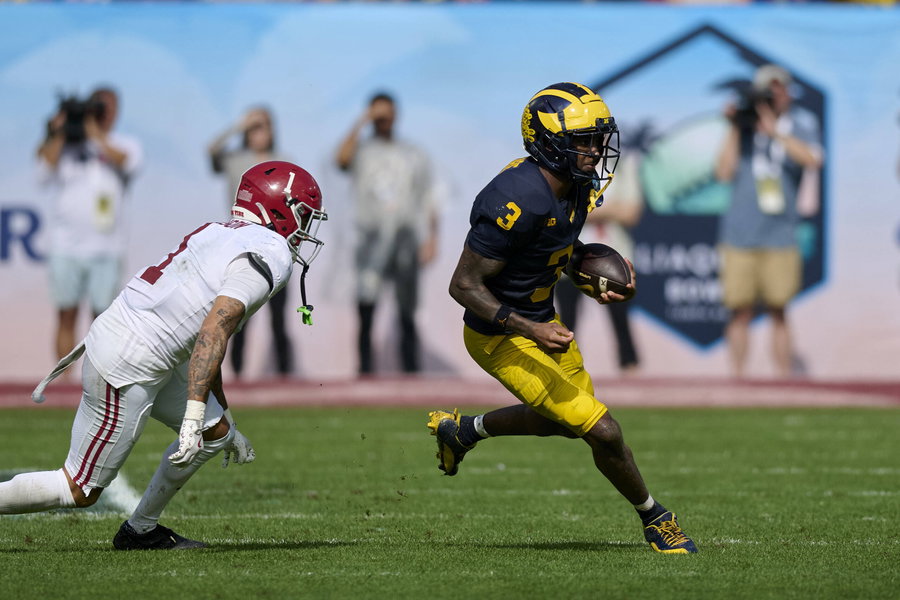 December 31, 2024: Michigan wide receiver Fredrick Moore 3 carries the ball as Alabama defensive back Domani Jackson 1 attempts to tackle during an NCAA, College League, USA football game between the Michigan Wolverines and Alabama Crimson Tide at Raymond James Stadium in Tampa, Florida. /CSM Tampa United States – ZUMAc04_ 20241231_faf_c04_068 Copyright: xMikexJanesx