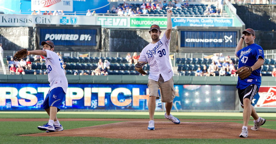 June 22, 2012 – Kansas City, MO, USA – Comedians Paul Rudd, Jason Sudeikis and Rob Riggle throw out first pitches before the game between the Kansas City Royals and St. Louis Cardinals at Kauffman Stadium in Kansas City, Missouri, Friday, June 22, 2012. Cardinals v Royals – ZUMAm67
