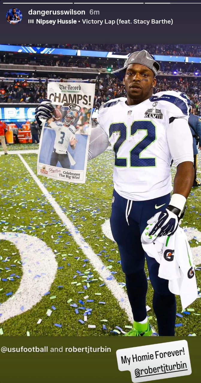 In the frame, Turbin was seen holding the cover page of The Record with the then-No. 3 Seahawk, Wilson. Turbin’s pic was from MetLife Stadium after winning SB XLVIII with the Seahawks. It was the first ever for Seattle. And first for Robert and Russ….
