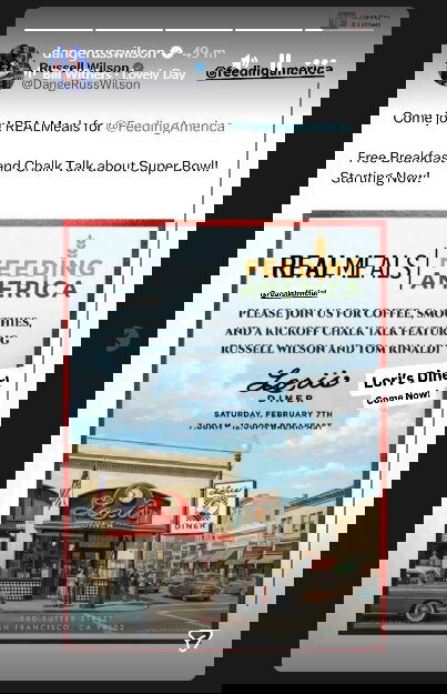 “Come join! REALMeals for @FeedingAmerica,” Russell Wilson captioned on his X, which he later reposted on Instagram. “Free Breakfast and Chalk Talk about the Super Bowl! Starting Now!”