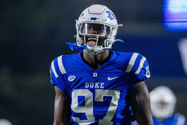 NCAA, College League, USA Football 2024: Elon at Duke Aug 30 August 30, 2024: Duke Blue Devils defensive end Wesley Williams 97 celebrates after a punt block in the second quarter against the Elon Phoenix in the ACC Football matchup at Wallace Wade Stadium in Durham, NC. Scott Kinser/CSM Credit Image: Scott Kinser/Cal Media Durham Nc United States EDITORIAL USE ONLY Copyright: xx ZUMA-20240830_zma_c04_283.jpg ScottxKinserx csmphotothree287042