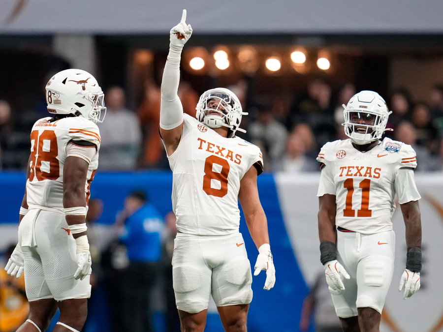 Linebacker Trey Moore Texas Longhorns, 8 gestures in celebration after sacking the Arizona State quarterback USA, Arizona State vs Texas Longhorns, College Football, Peach Bowl CFP Quarterfinal Game, 01.01.2025 USA, Arizona State vs Texas Longhorns, College Football, Peach Bowl CFP Quarterfinal Game, 01.01.2025 Atlanta *** Linebacker Trey Moore Texas Longhorns, 8 gestures in celebration after sacking the Arizona State quarterback USA, Arizona State vs Texas Longhorns, College Football, Peach Bowl CFP Quarterfinal Game, 01 01 2025 USA, Arizona State vs Texas Longhorns, College Football, Peach Bowl CFP Quarterfinal Game, 01 01 2025 Atlanta Copyright: xEibner-Pressefoto/ScottxColemanx EP_SCN