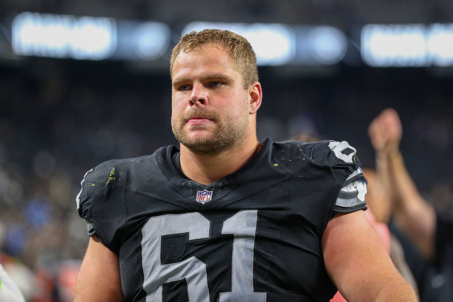 LAS VEGAS, NV – DECEMBER 14: Las Vegas Raiders guard Jordan Meredith 61 walks off of the field after the Los Angeles Chargers vs Las Vegas Raiders game on December 14, 2023, at Allegiant Stadium in Las Vegas, NV. Photo by Jordon Kelly/Icon Sportswire NFL, American Football Herren, USA DEC 14 Chargers at Raiders EDITORIAL USE ONLY Icon2312140654