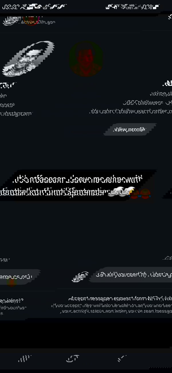 On Sunday, Boswell took to Instagram and shared a story showing a threatening text message he received from a fan. “Go kill yourself fn, I lost a game cs of u,” the message read, clearly expressing frustration. Rather than escalating the situation, Boswell responded in a lighter tone, reposting the message and writing, “It’s offseason. Leave me alone with football stuff until September,” he wrote, while adding a couple of laughing emojis.