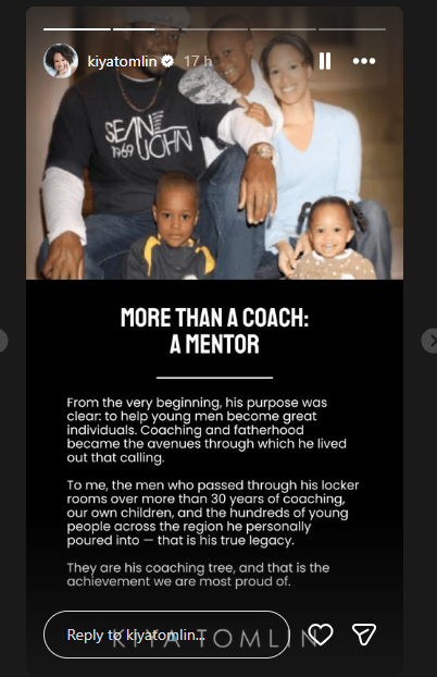 “From the very beginning, his purpose was clear: To make young men become great individuals,” wrote Kiya Tomlin on her IG story. “Coaching and fatherhood became the avenues through which he lived out that calling. To me, the men who passed through his locker rooms over more than 30 years of coaching, our own children, and the hundreds of young people across the region he personally poured into – that is his true legacy.”
