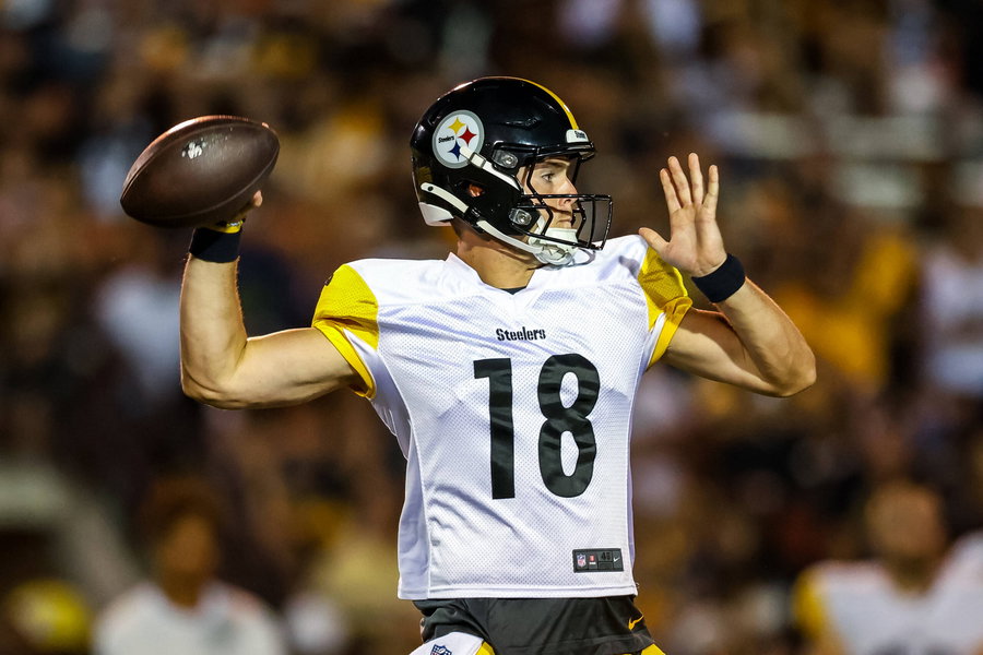 August 1, 2024, Latrobe, Pennsylvania, USA: Pittsburgh Steelers quarterback WILL HOWARD 18 loads up to pass during the Steelers Training Camp in Latrobe, Pennsylvania. Latrobe USA – ZUMAg257 20240801_zsp_g257_031 Copyright: xBrentxGudenschwagerx