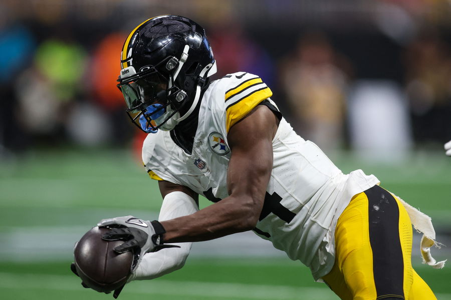 Sep 8, 2024; Atlanta, Georgia, USA; Pittsburgh Steelers wide receiver George Pickens (14) catches a pass against the Atlanta Falcons in the third quarter at Mercedes-Benz Stadium. Mandatory Credit: Brett Davis-Imagn Images