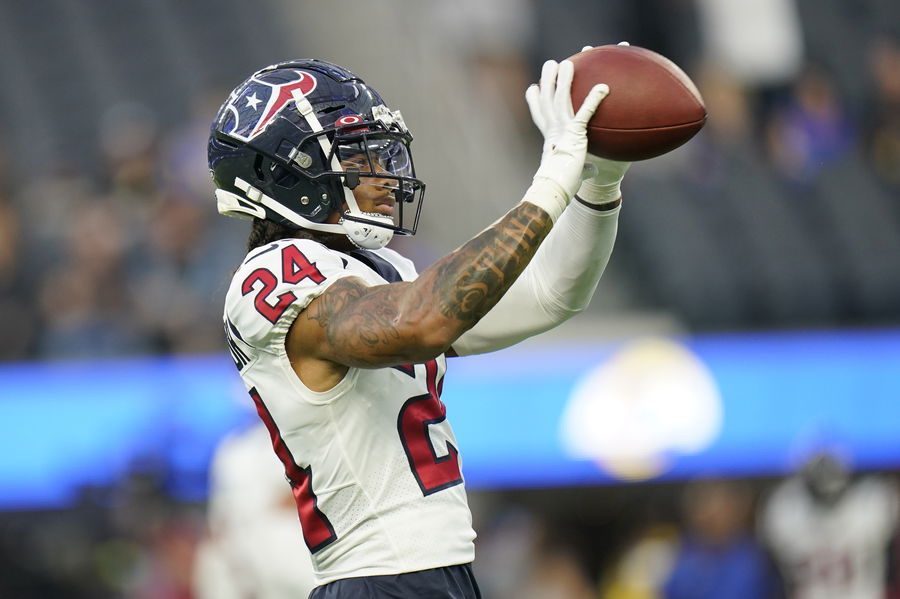 Houston Texans cornerback Derek Stingley Jr. makes a catch during warm-ups before a preseason NFL football game against the Los Angeles Rams Friday, Aug. 19, 2022, in Inglewood, Calif. (AP Photo/Jae C. Hong)