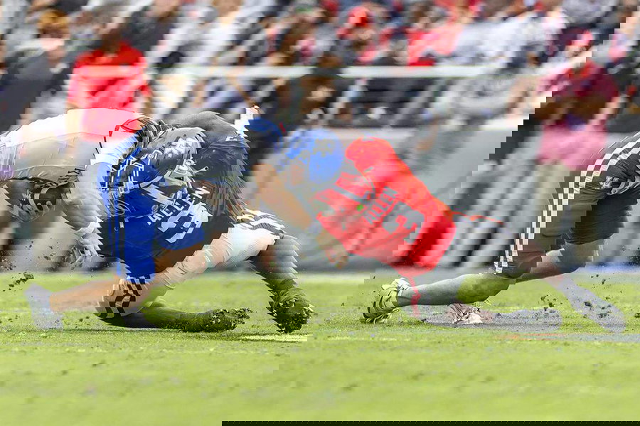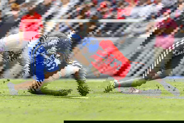 October 4, 2025: Kentucky quarterback Cutter Boley 8 is tackled by Georgia linebacker CJ Allen 3 at Sanford Stadium on Saturday, Oct. 4, 2025, in Athens, Georgia. – ZUMAm67_ 20251004_zaf_m67_014 Copyright: xRyanxC.xHermensx
