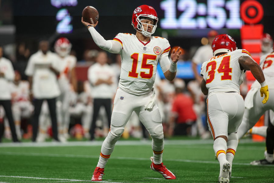 Sep 22, 2024; Atlanta, Georgia, USA; Kansas City Chiefs quarterback Patrick Mahomes (15) throws a pass against the Atlanta Falcons in the second quarter at Mercedes-Benz Stadium. Mandatory Credit: Brett Davis-Imagn Images